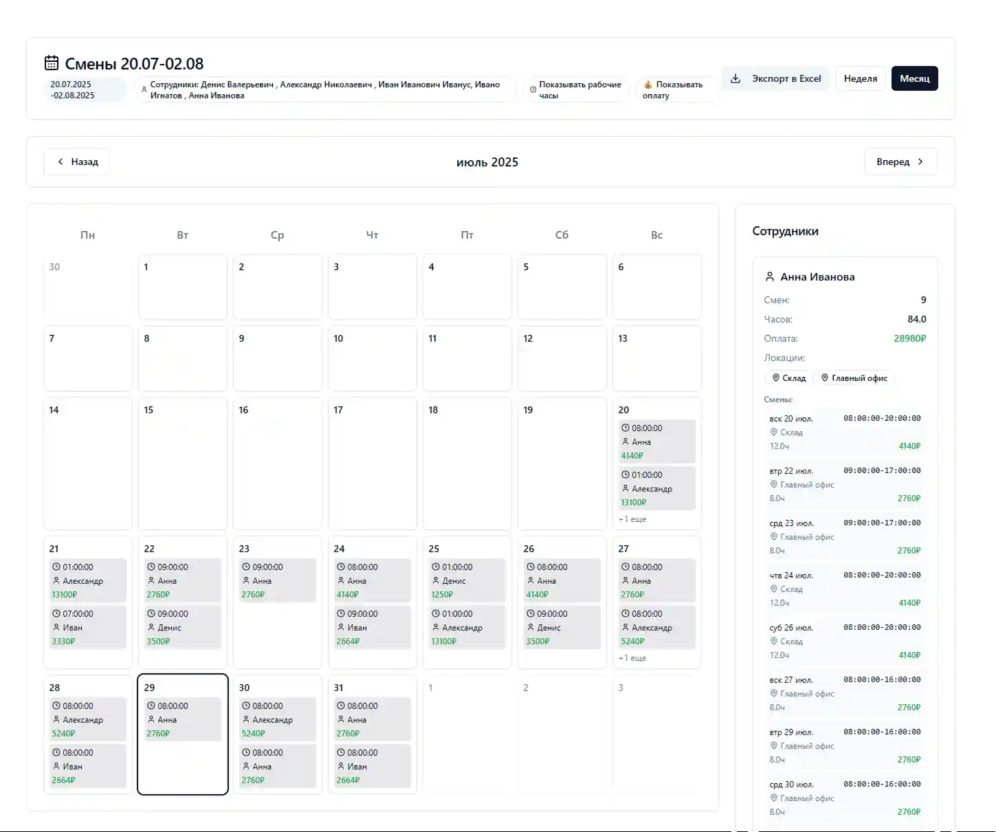Автоматическая проверка норм 40/36 часов, предупреждения о нарушениях, контроль чтобы сотрудник не был в двух местах одновременно.